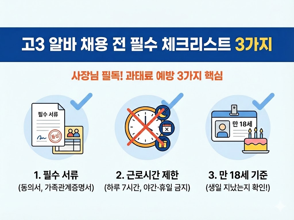 오늘은 수험생(고3) 채용 시 사장님이 반드시 체크해야 할 '연소근로자 법적 기준'과 '근로시간 제한', '필수 서류'까지 완벽하게 정리해 드리겠습니다.